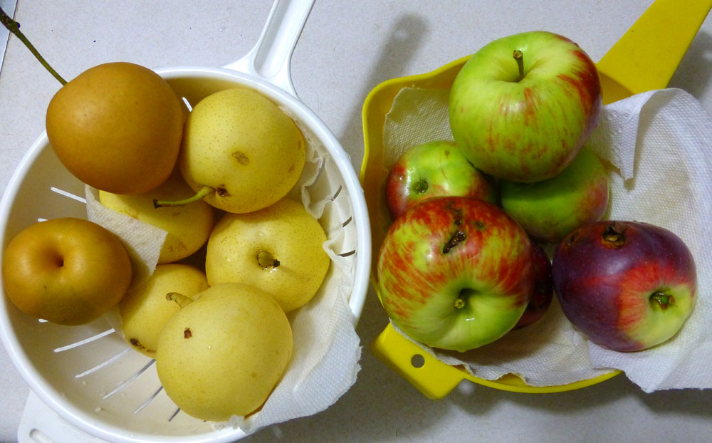Several of these fruits have wounds where squirrels tried to chew through the footies, but I can cut around those. I weighed the bagful and it was six pounds! I put the apples in the fridge (I still need to check and see if the Honeycrisp need cold storage) and the pears out on the counter to ripen a bit more.